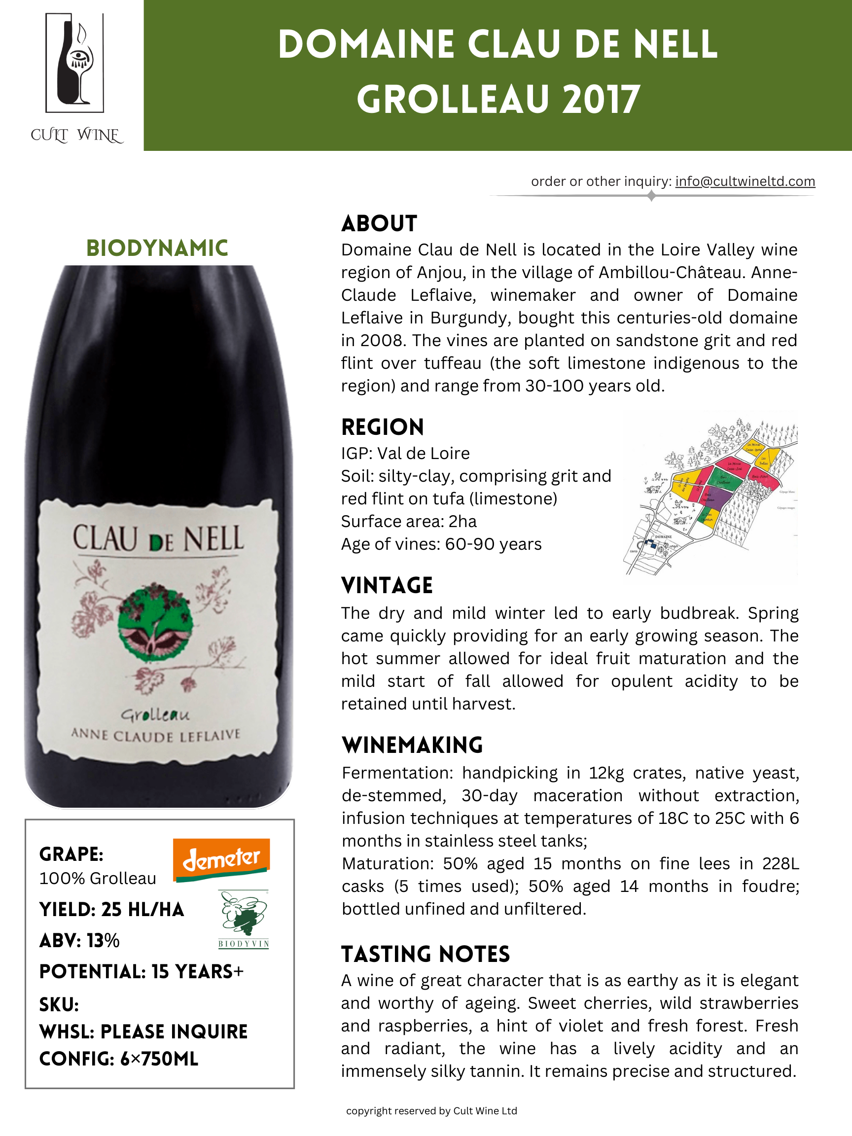 Domaine Clau de Nell, located in Anjou, is a biodynamic winery known for its commitment to sustainable viticulture and artisanal winemaking. With a focus on expressing the unique terroir of the region, the domaine, under the guidance of the late Anne-Claude Leflaive and Christian Jacques, crafts exceptional wines from vines planted on sandstone grit and red flint over tuffeau.