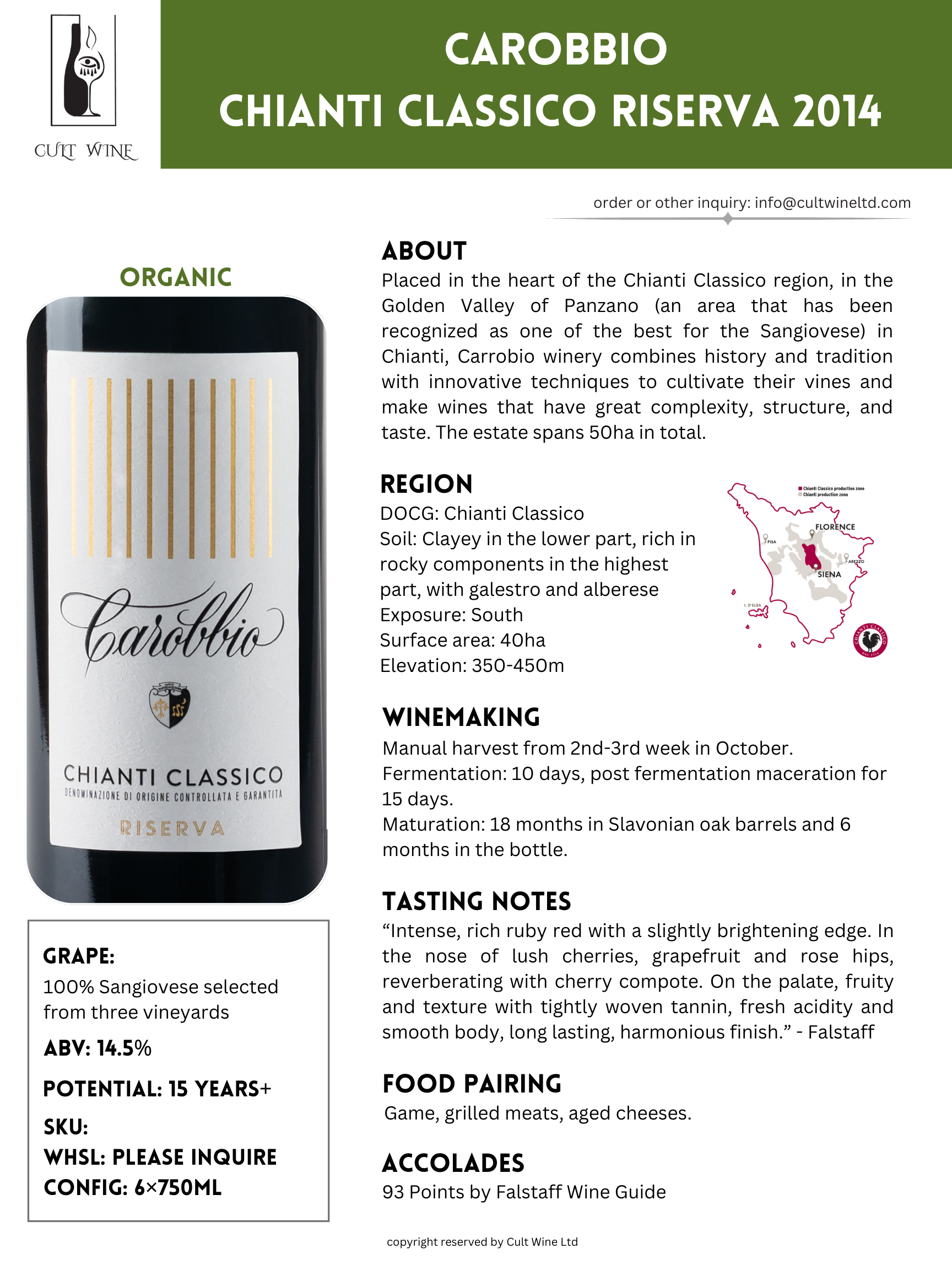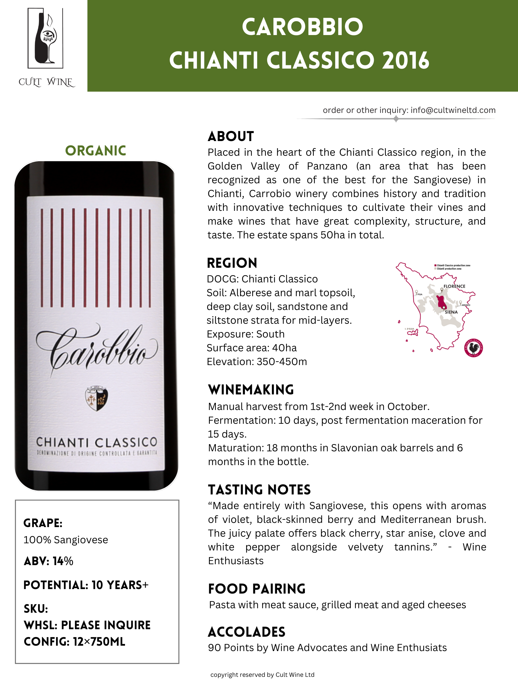 Carobbio Winery, located in the Golden Valley of Panzano, which is recognized as one of the best sites for Sangiovese, is renowned for its commitment to producing high-quality wines. With a history dating back to the 14th century, the estate’s dedication to organic farming and traditional winemaking methods results in expressive and terroir-driven wines.