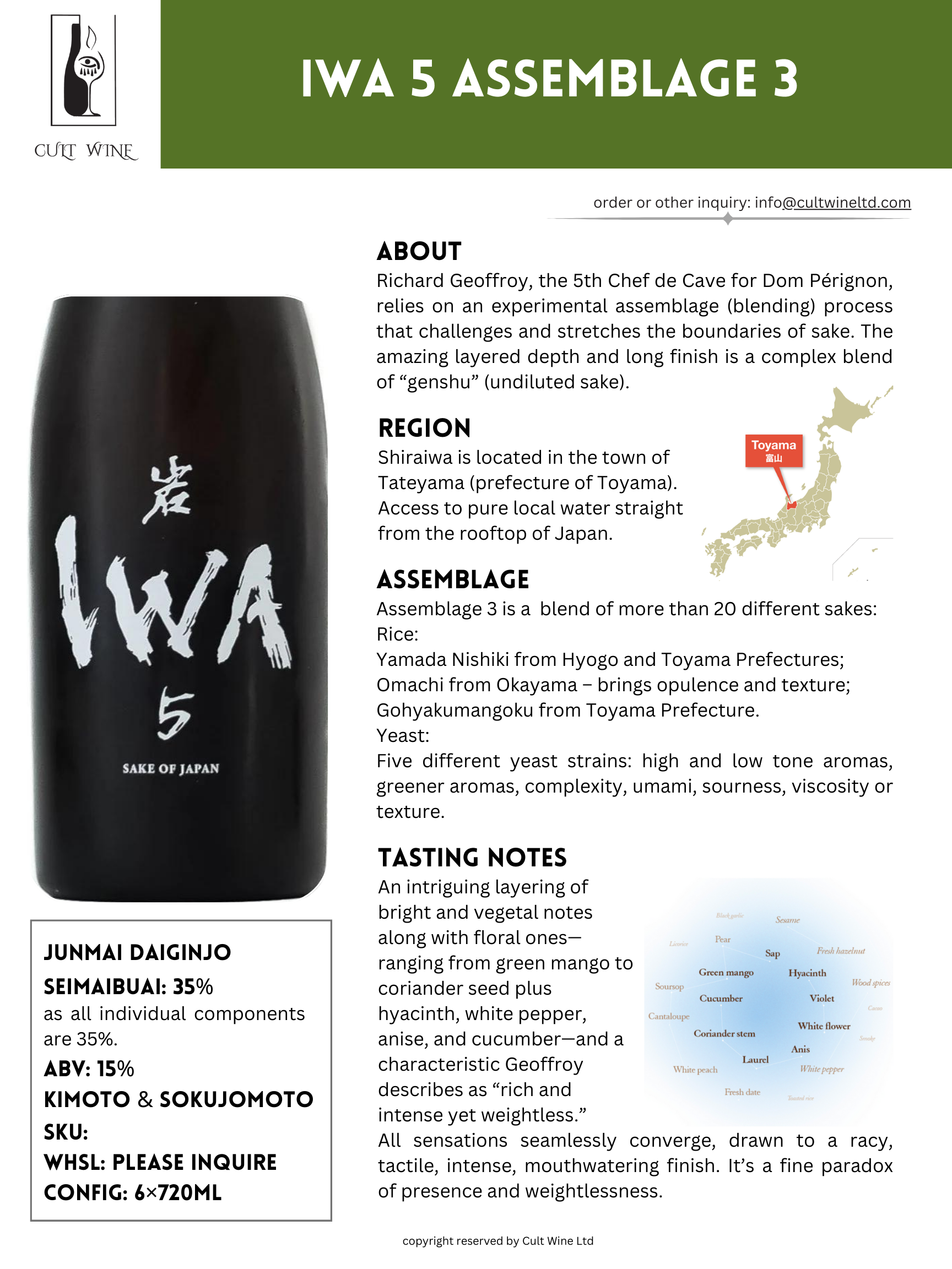 “IWA 5 challenges the boundaries of what sake can be, offering a multilayered experience that bridges the gap between East and West.” – Robert Parker